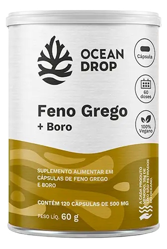 O feno grego em cápsulas da Ocean Drop contém 300 mg do extrato de semente de feno grego + 8,86g de Boro e sugere-se que seja consumido 2 cápsulas por dia, antes da refeição.