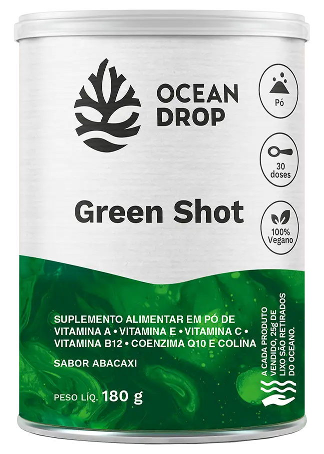 O Green Shot da Ocean Drop contém colina, vitamina A, vitamina E, vitamina C e vitamina B12 que juntas, oferecem benefícios, como auxílio no(a):